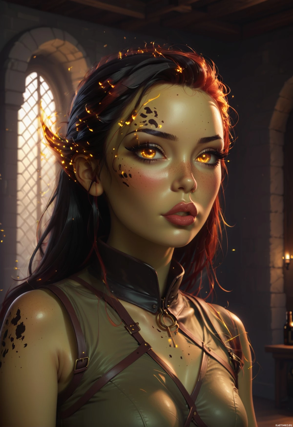 striking makeup that includes prominent eyelashes and intricate tattoos or markings on her face and neck. Her hair is red with a streak of black, styled in a way that suggests motion. She wears a metallic armor with straps around her neck and shoulders, indicative of