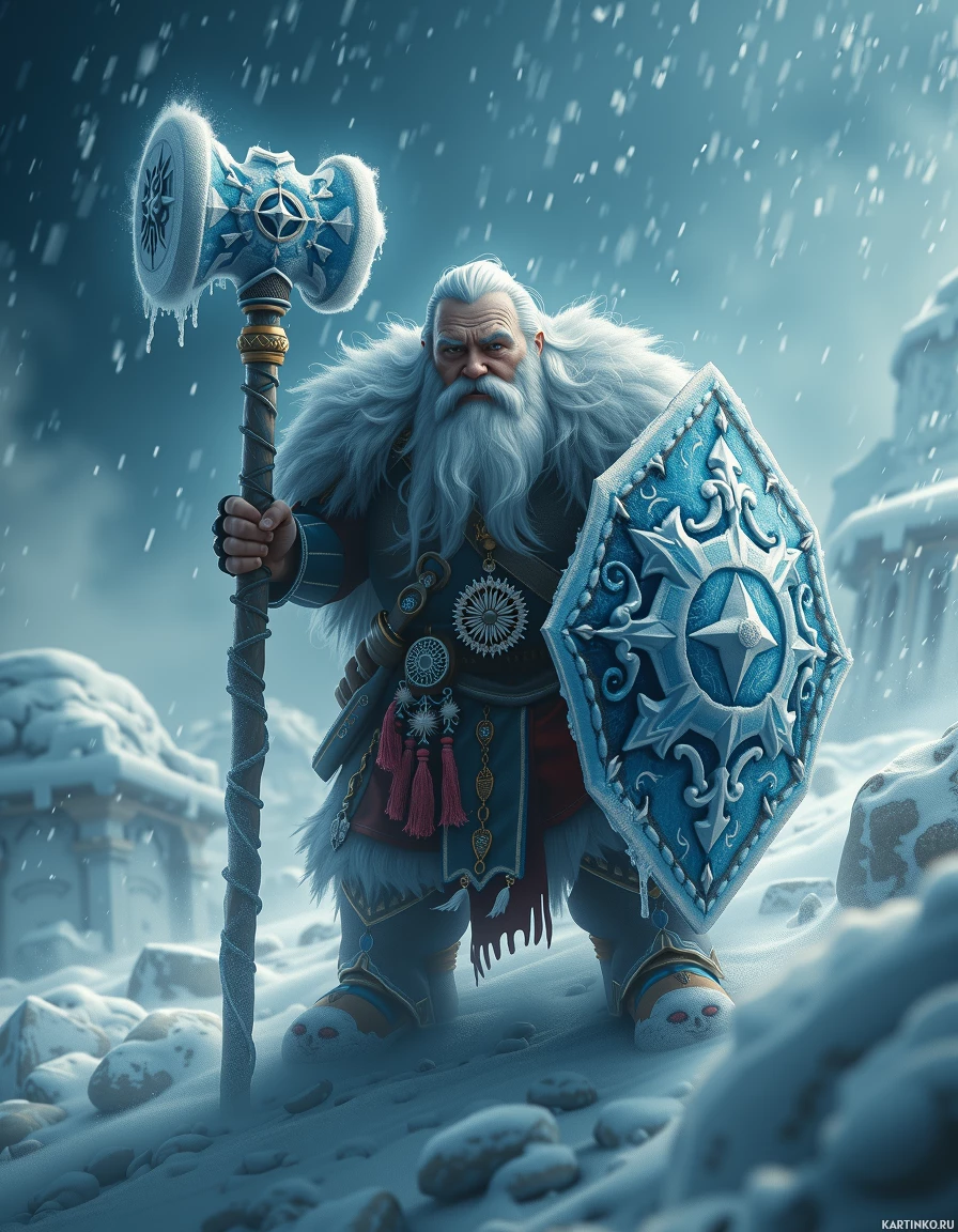 the fantasy genre, set in a snowy environment. This individual is portrayed as a dwarf, recognizable by his beard and armor. He is holding a hammer in one hand and a shield in the other. The armor he wears suggests