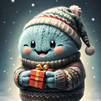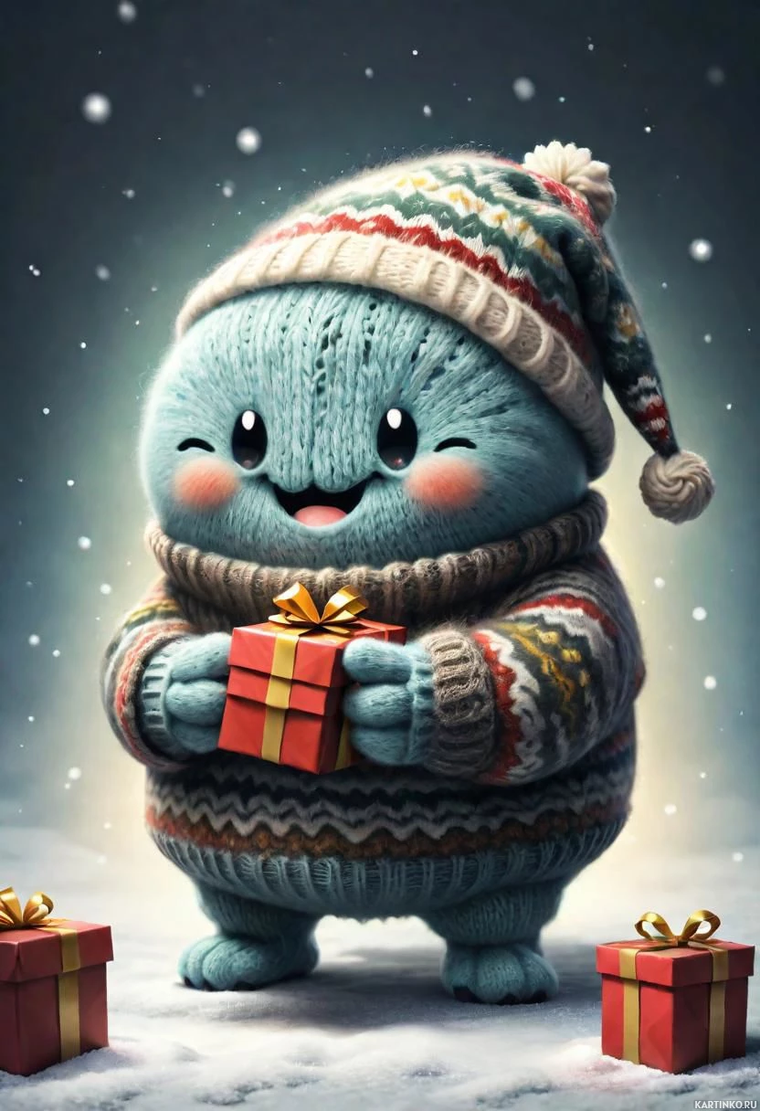 a cold atmosphere. There are presents wrapped in red and gold paper at the base of the character, indicating that it might be involved in gift-giving or receiving activities.