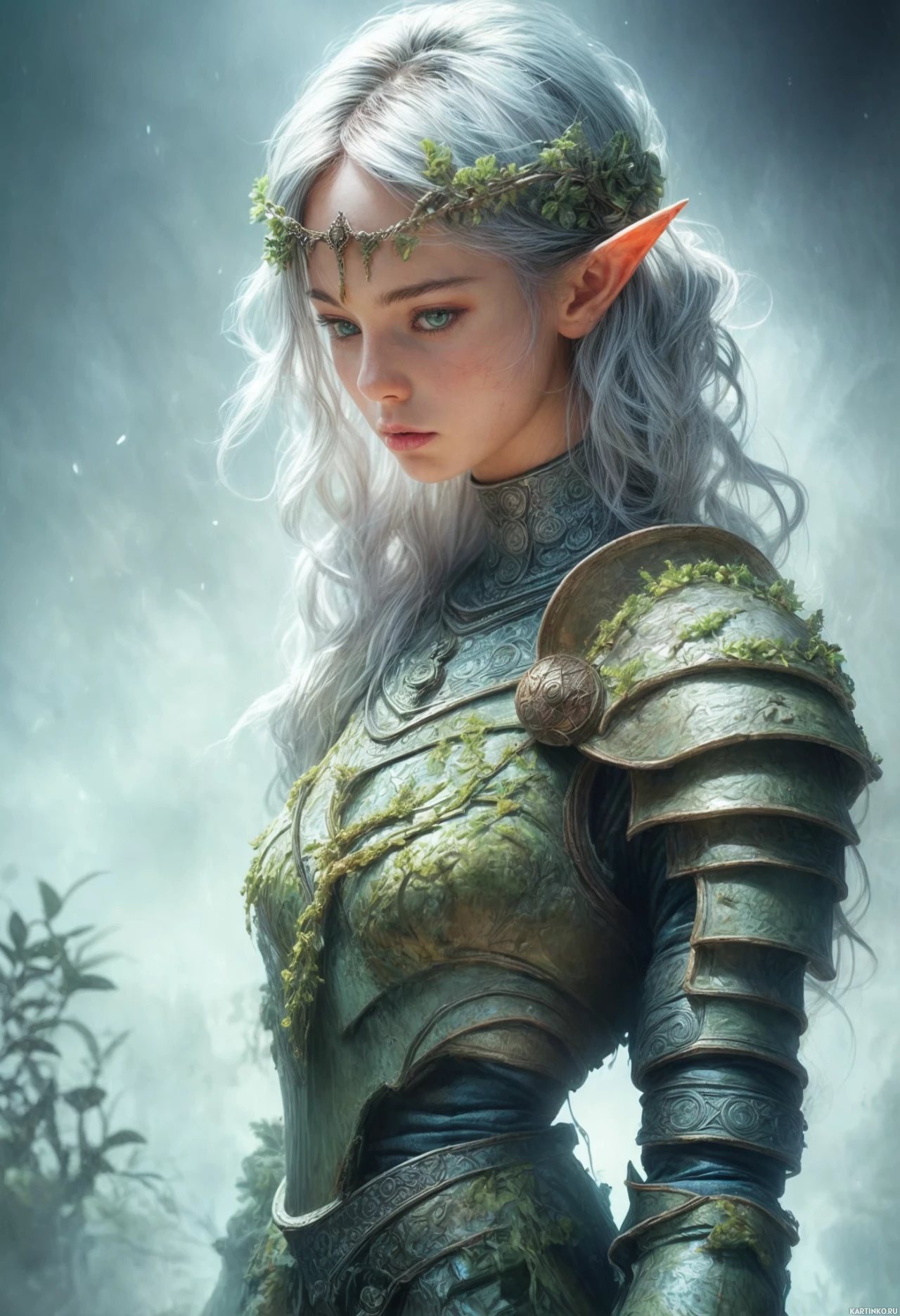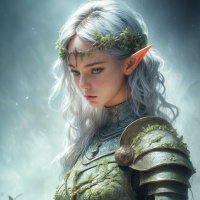 white hair and is styled to resemble an elf, commonly associated with mythological lore. The character is wearing armor that appears to be made of metal and is adorned with moss or vines, giving the impression of having a connection with nature. The background features