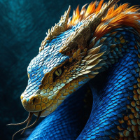 shades of blue and yellow, giving it an unusual and striking appearance. Its mouth is open as if it's hissing or preparing to strike. On its head, there are distinctive features like horn-like protrusions and what appears to be a crown or headdress, adding to the creature's regal or mystical aura. The background is dark and muted, suggesting a night scene or perhaps an underground environment, which contrasts with