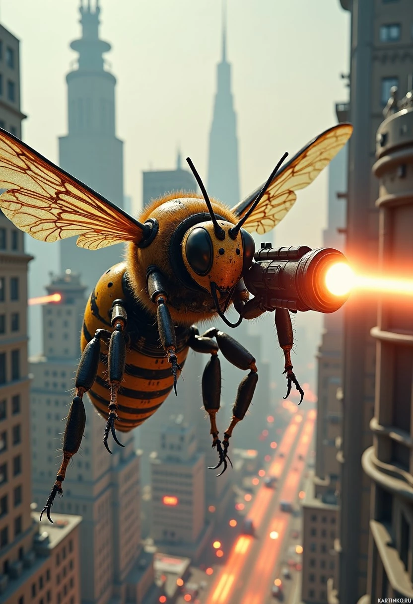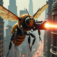The image depicts a bee that has been anthropomorphized, meaning it is given human-like characteristics. This bee is not an ordinary one but rather a robotic or mechanically enhanced version, indicated by the visible