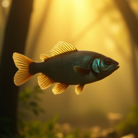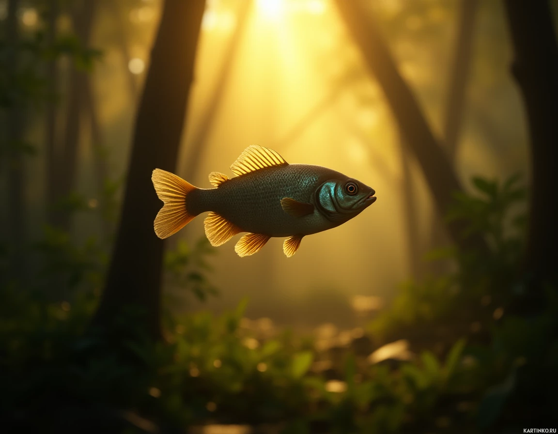 wooded area. The water where the fish is located reflects the sunlight, indicating it might be daytime. There are blurred out sunbeams that illuminate