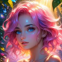 colorful flowers and foliage that suggests a magical or enchanted environment. There's a subtle glow around her head and shoulders, which might be interpreted as a halo or