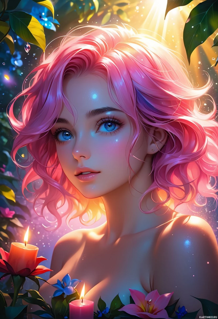 magical aura. A single pink flower with a red center is placed near the bottom right corner, adding to the overall ethereal theme of the image. The artwork conveys a sense of tranquility and otherworldly beauty.