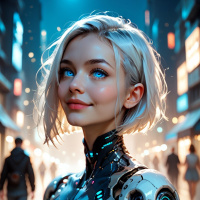 advanced technology or a dystopian setting. Her attire is sleek and metallic, with designs that imply functionality and possibly