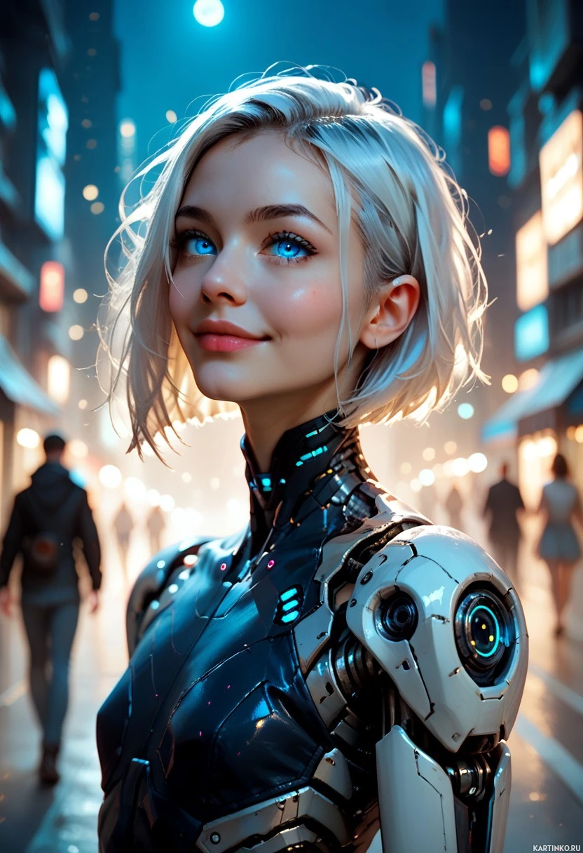 an urban environment at nighttime, lit by artificial lights from nearby buildings, which adds to the futuristic atmosphere of the scene.