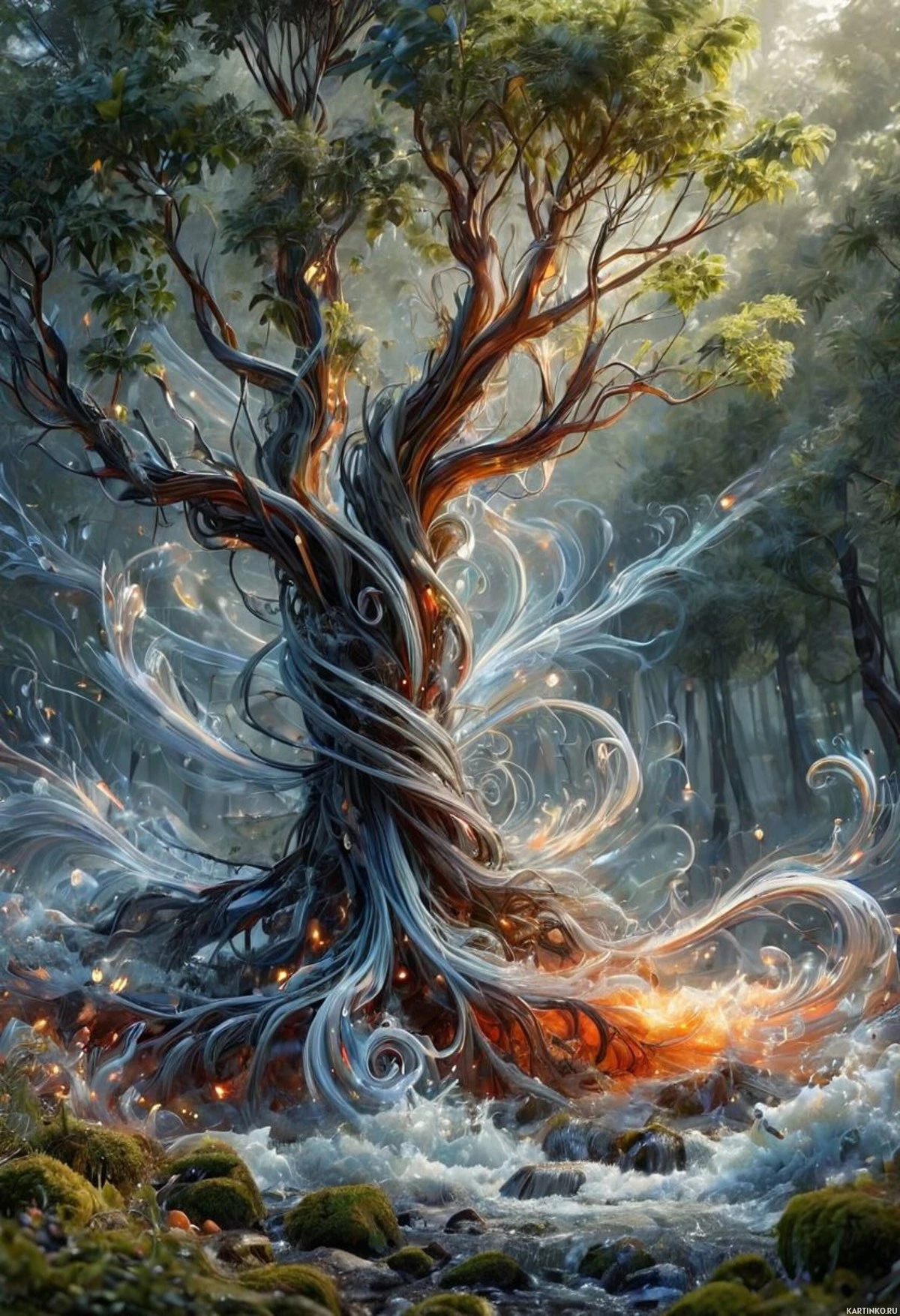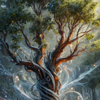 nature of life or the spirits associated with the tree. The background is filled with tall, slender trees that appear to be bathed in a soft,