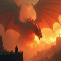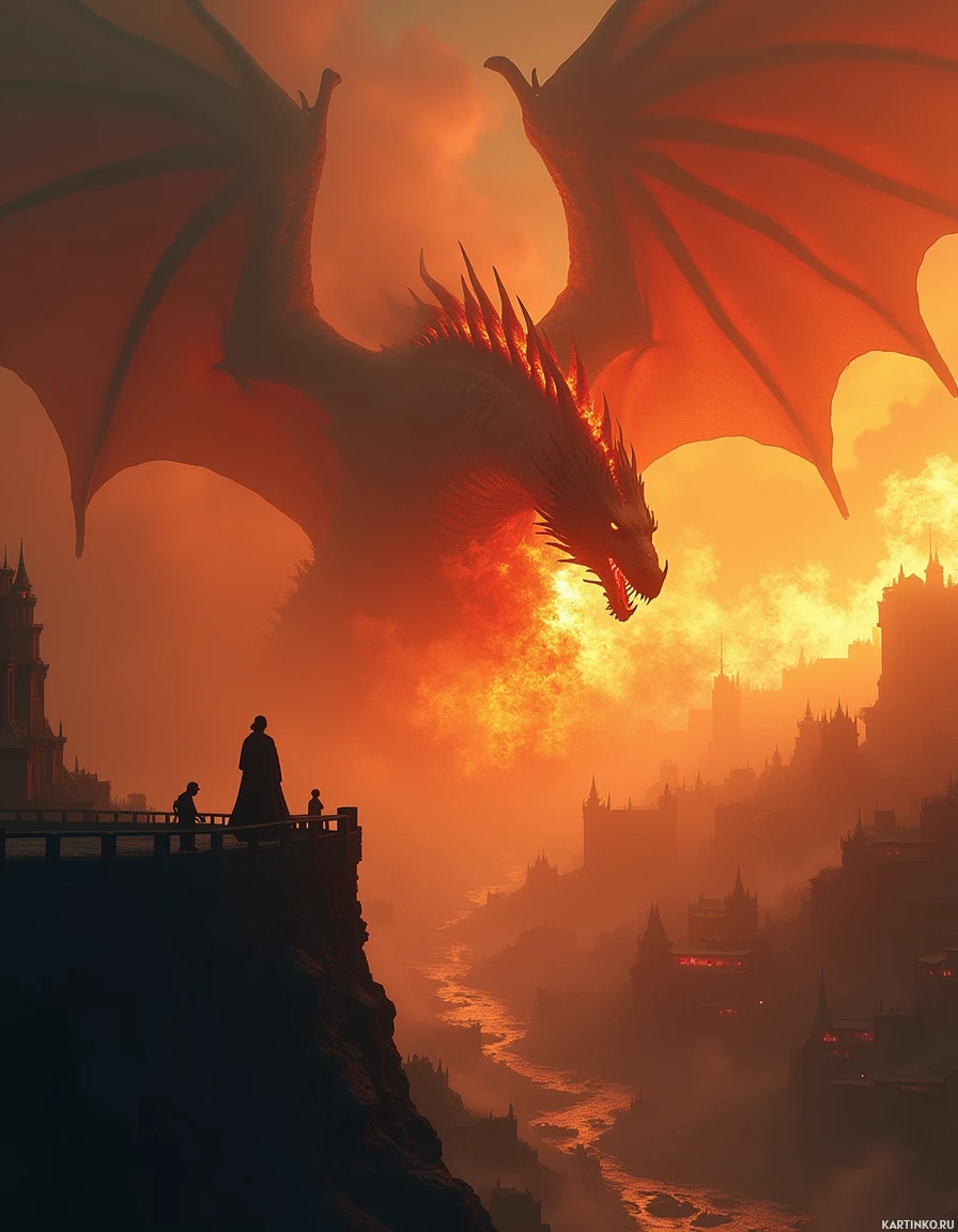 a fantasy scene with a dragon as the central figure. The dragon, characterized by its fiery breath and