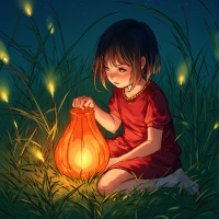 a soft glow around her, illuminating her face and the immediate area around her. Her expression and the setting suggest she might be engaged in an activity like collecting fireflies or observing a special moment under