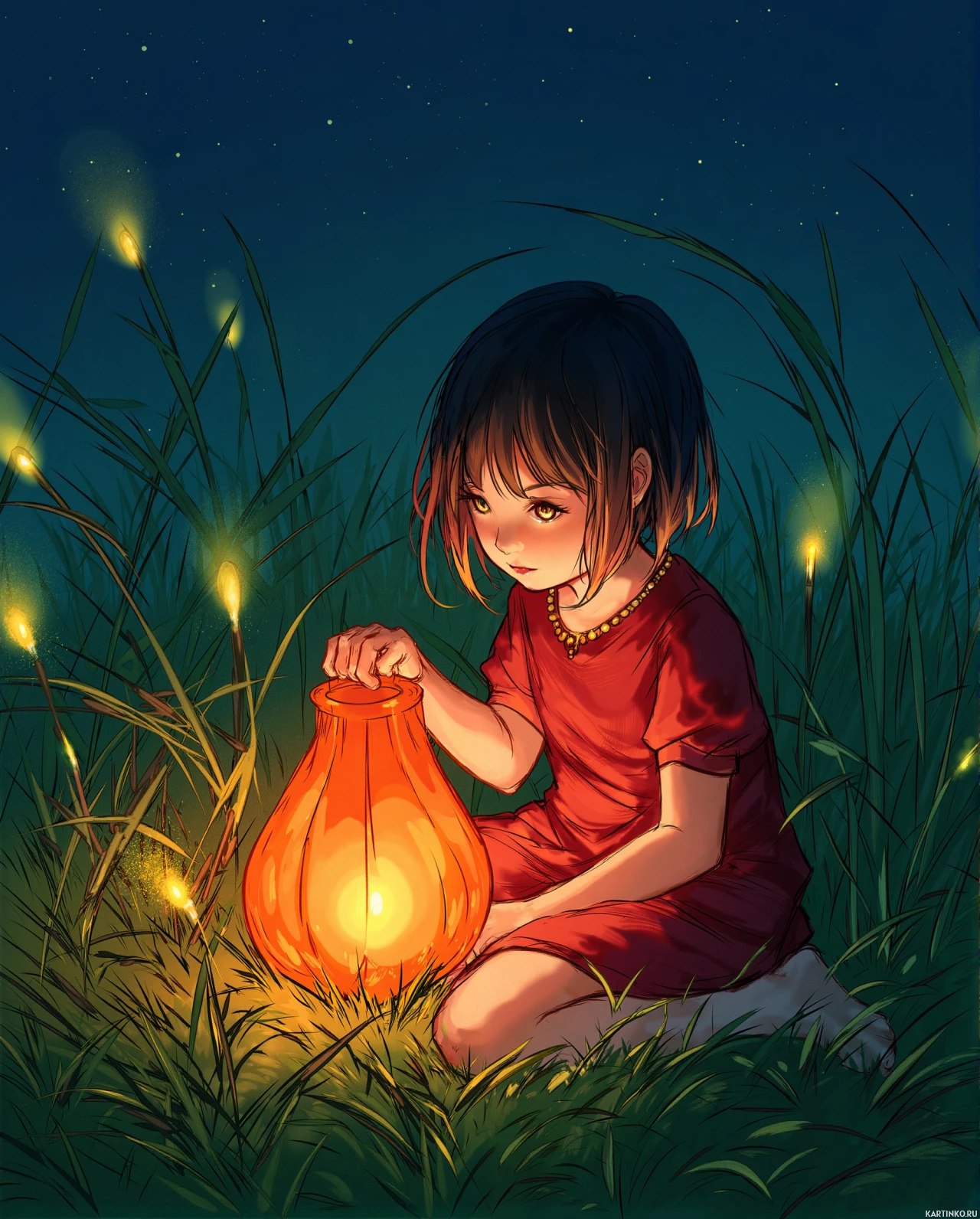a young girl is depicted in the night, kneeling down among tall grass. She appears to be looking at something with great interest or concern. The girl is holding a small lantern that casts