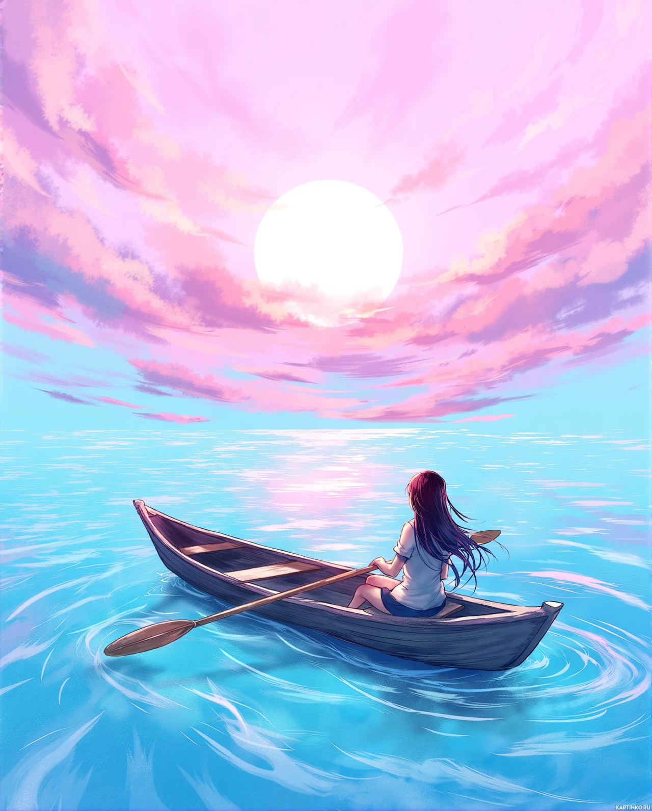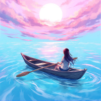 reflection of the sun can be seen on the water around her boat. The overall mood of the picture is serene and contemplative.