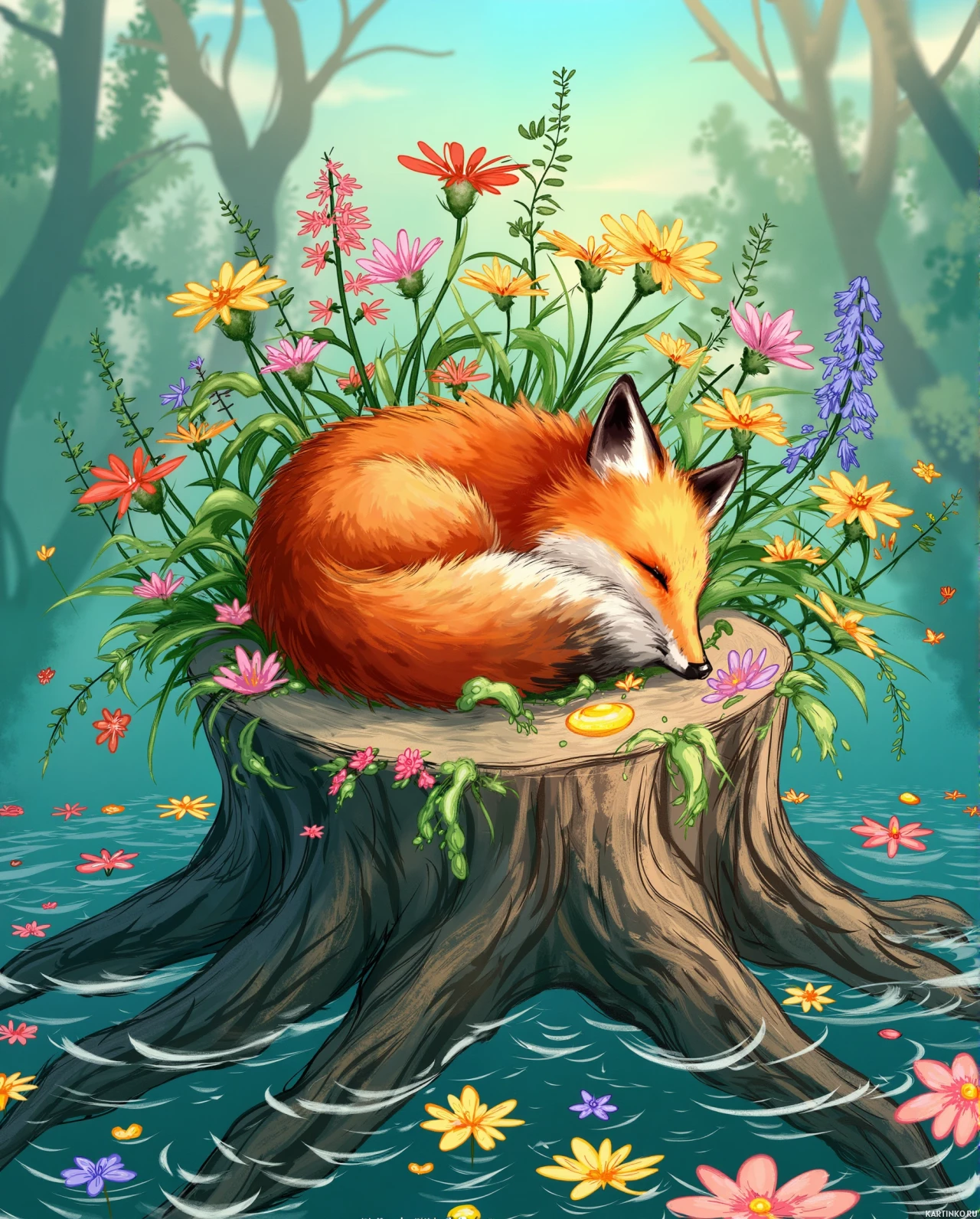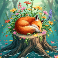a serene scene featuring a fox. The fox is resting comfortably on the stump of a fallen tree, surrounded by an array of