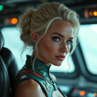 a neutral expression on her face. The setting suggests a futuristic or science fiction theme, possibly related to aviation or space exploration.