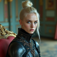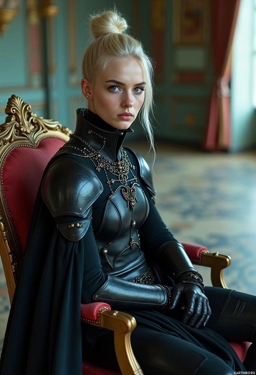 a young woman with blonde hair, seated on what appears to be an ornate chair or throne. She is wearing a dark, metallic armor that has