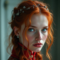 regal look. The woman's expression is one of quiet intensity, and her pose suggests a mood of seriousness or deep thought. The lighting in the image is soft and subdued, enhancing the moody atmosphere of the portrait.
