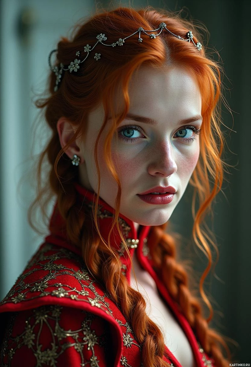 fair skin and wears makeup that accentuates her eyes and lips. Her gaze is directed off to the side, away from the camera, giving her a contemplative or introspective appearance. She's dressed in a detailed costume that suggests a historical or