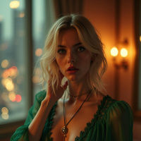 light hair and is wearing a green, flowing dress with lace detailing at the neckline. Her expression seems contemplative or perhaps slightly melancholic. Behind her, there are softly lit candles or lanterns that add to the ambient mood of the photograph.