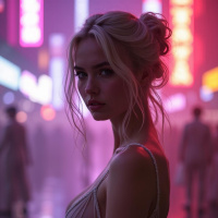 neon lights from signs that are typical of urban environments, and there appears to be mist or rain in the air, which gives the scene an ethereal quality.