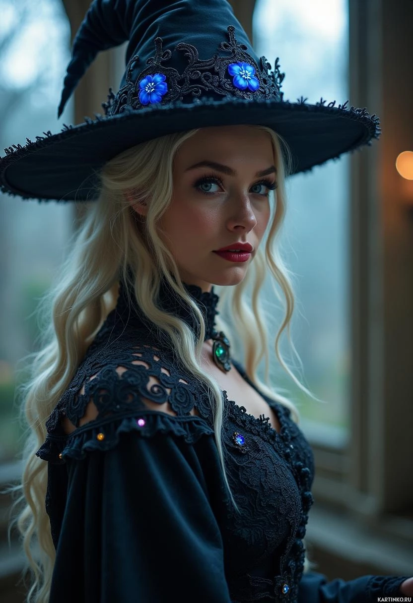 witch hat on her head. The costume also includes elements such as lace and sparkles, giving it an ethereal appearance. The woman is gazing off to the side with