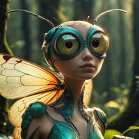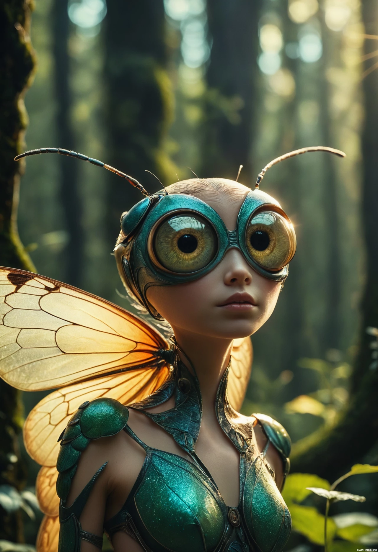 a fantasy character that appears to be a fusion of human and insect features. The character has insect-like wings,