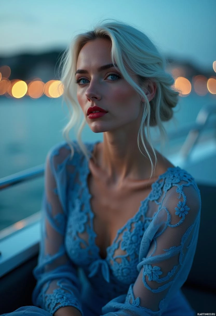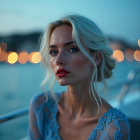 loose waves, and she is looking directly at the camera with a slight smile. Behind her is a blurred setting that suggests an evening ambiance, possibly a harbor or dock area, given the visible water and