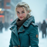 blonde hair styled into a loose updo with strands falling over her shoulders. The woman is smiling slightly and looking towards the camera. She is dressed in a dark green coat with buttons down the front, suggesting it's either cold or fashionable for