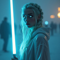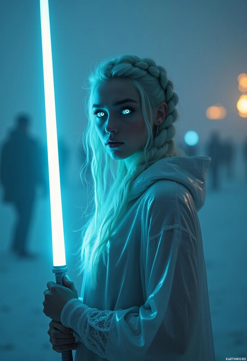 white hair and is holding a blue sword, which is commonly associated with characters like Rey from the "Star Wars" franchise. They are wearing