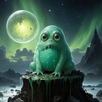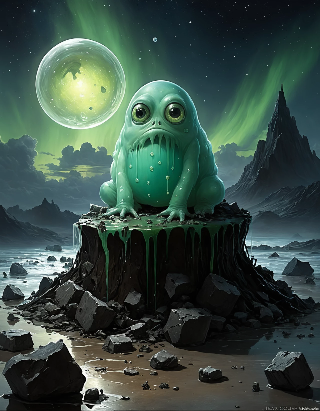 a fantastical scene featuring a monster, which appears to be a combination of various animal features. It has the body of a frog, with bulging eyes and