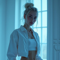 a blue tint. She is dressed in workout attire, consisting of a white jacket worn open over a fitted