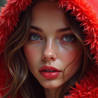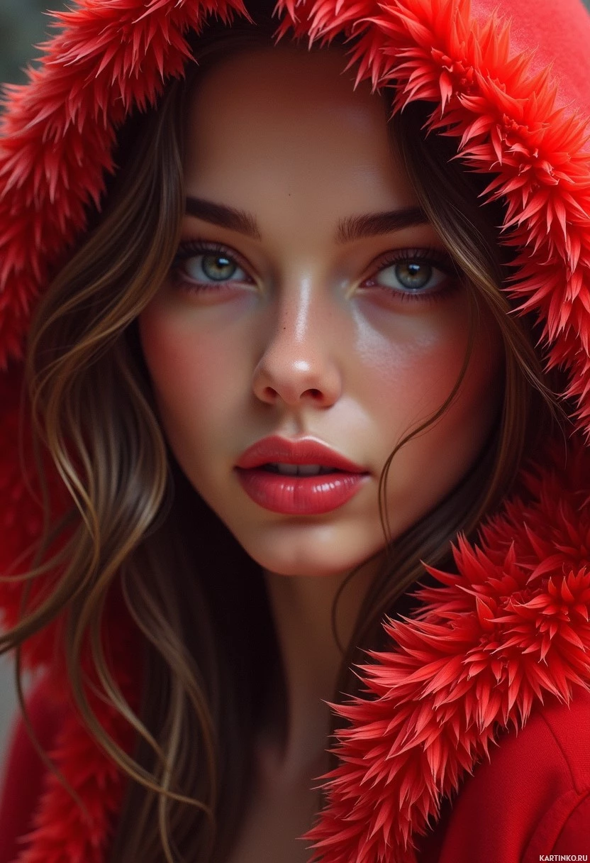 blue eyes that are looking directly at the camera. Her lips are slightly parted as if she's posing for the photo. She wears a vibrant red