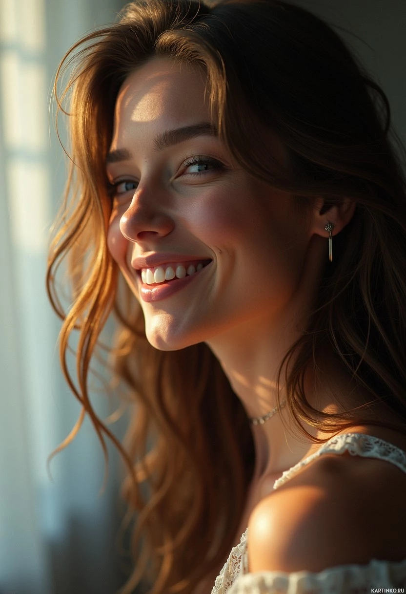 a radiant smile and is looking directly at the camera, giving an impression of warmth and happiness. Her makeup is done in soft tones that enhance her