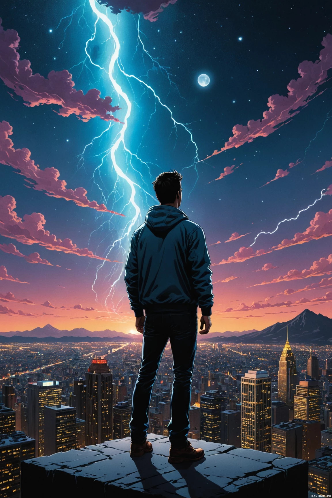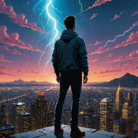 casual attire, including jeans and a hoodie, with their hands in pockets. A lightning bolt arcs across the sky, suggesting an imminent storm or intense