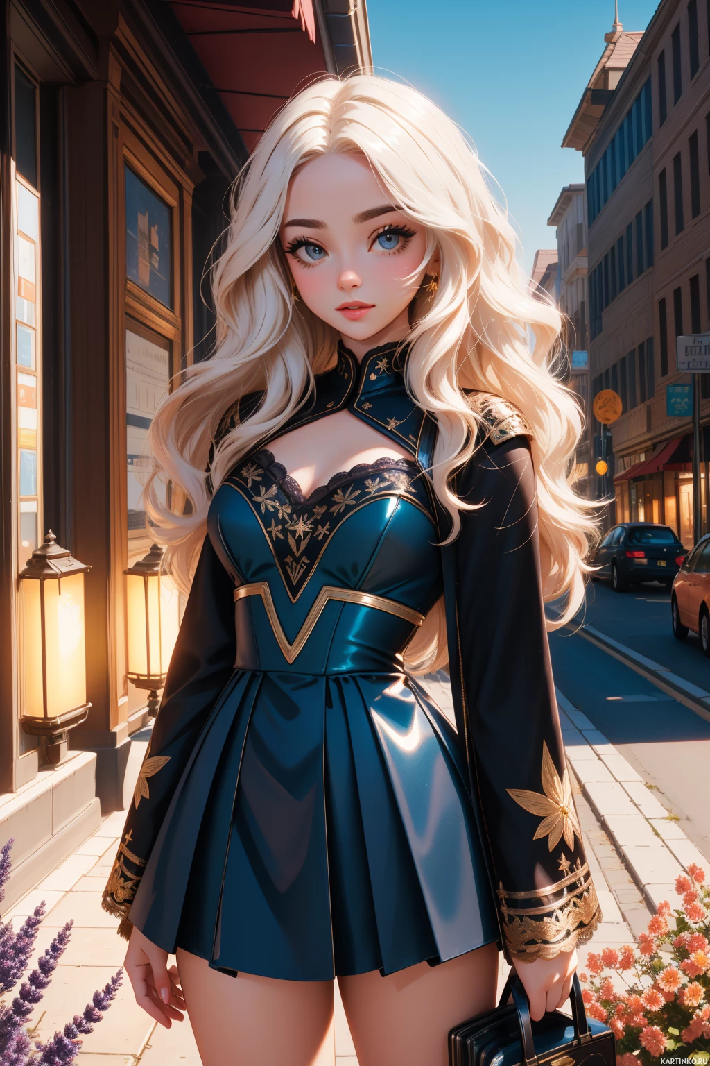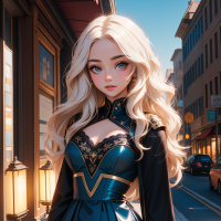 female character with long blonde hair and blue eyes. She has