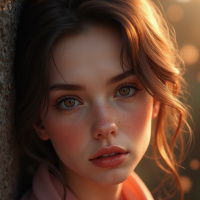 natural light filtering through the scene, which creates a gentle glow on her face and hair. The overall style of the image is reminiscent of portrait photography, commonly used for fashion or beauty purposes.