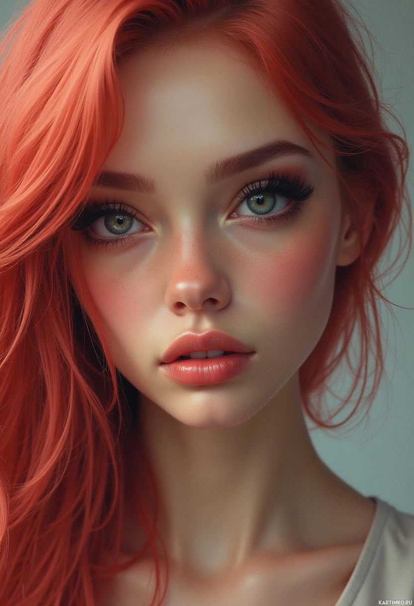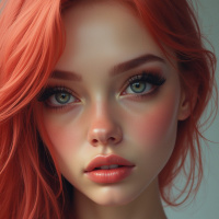 a young woman with striking red hair. Her features include full lips, prominent cheekbones, and large,