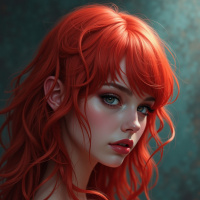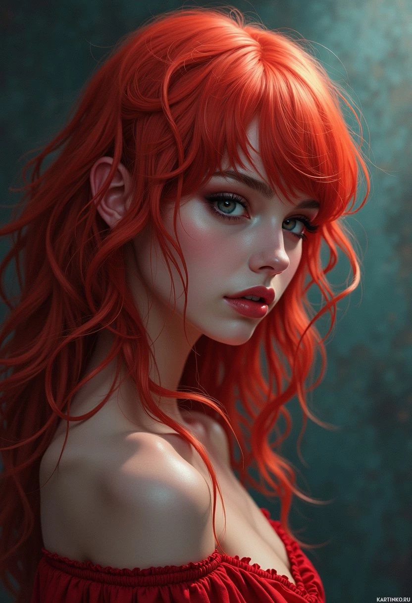 soft hues, giving her a subtle yet striking appearance. She wears a red off-the-shoulder garment that adds to the overall
