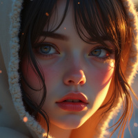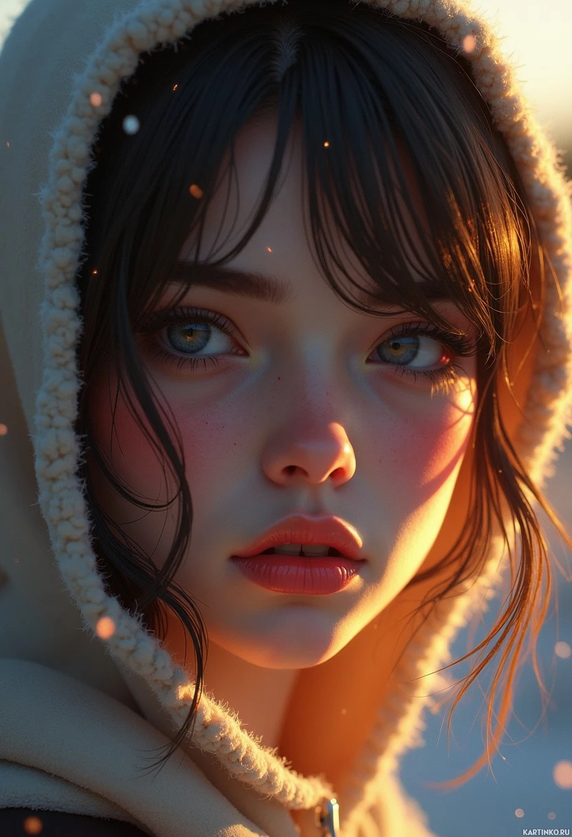 soft focus that seems to indicate it's either dawn or dusk due to the lighting on her face and in the sky. The setting appears to be an outdoor location with a hint of snowy ground visible at the bottom edge of the frame. There are also small, sparkling motes, like snowflakes, floating in the air, which adds to the wintry or serene atmosphere of the scene. The overall mood of the image is tranquil and introspective, capturing a quiet moment with the subject dressed appropriately for cold weather and the setting evoking a winter ambiance. The girl's expression is neutral yet thoughtful.