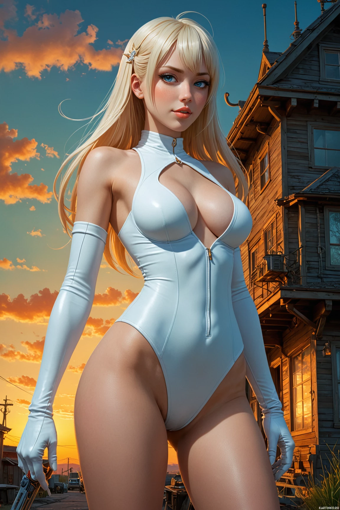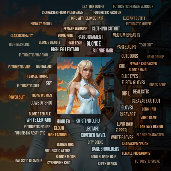 blonde hair. She is wearing a tight, sleeveless white bodysuit that has