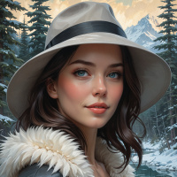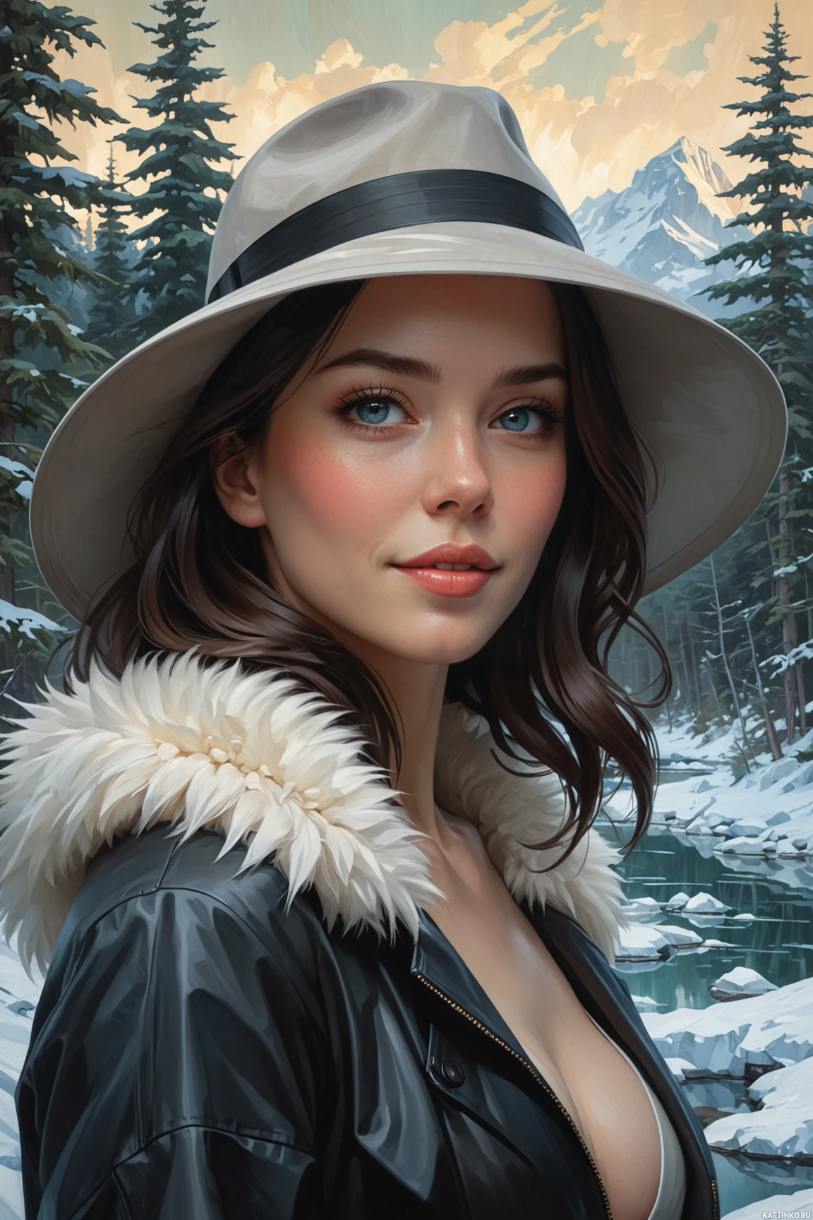 defined eyebrows and lushly curled eyelashes, contributing to an elegant appearance. Her lips are subtly colored, blending well with the overall natural look of the portrait. In terms of attire, she is accessorized with a wide-brimmed hat that appears to be made of a sturdy material suitable for winter wear. The hat's brim is tilted slightly over her eyes, adding a touch of style and mystery to her overall look. Her gaze and the setting suggest a moment of contemplation or waiting in a serene, outdoor environment during winter.