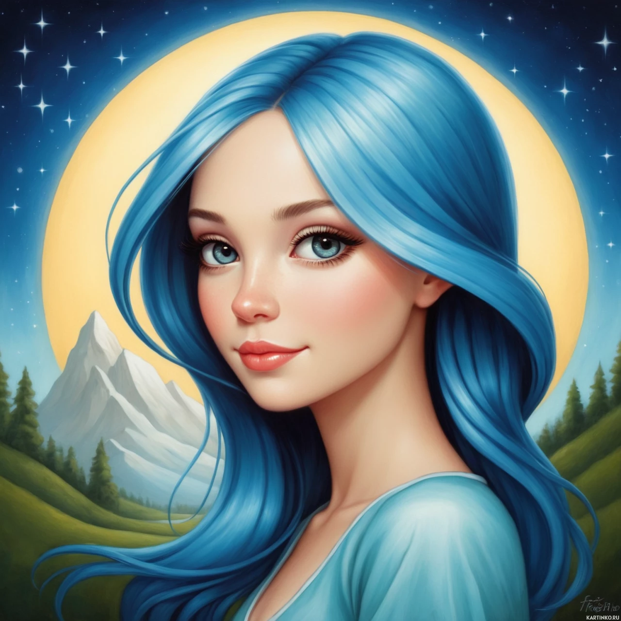 blue dress that suggests a serene or ethereal quality. The moon is visible in the top left corner of the illustration, adding to