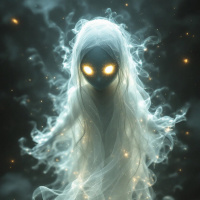the ghostly figure, there are small twinkling lights that give off a star-like effect, enhancing the magical or otherworldly feel of the image. The overall color palette is muted, with dark tones predominating, which contributes to the spooky and mysterious