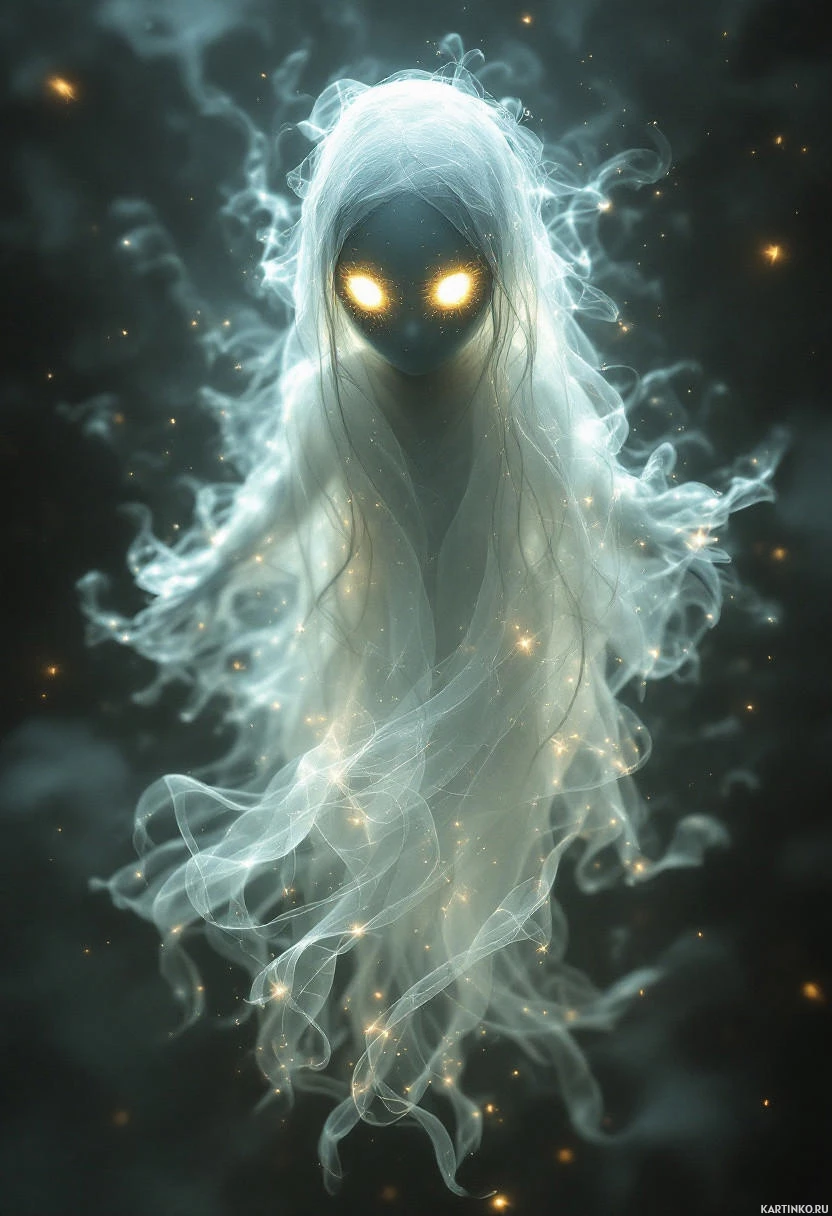 a fantastical scene with a ghostly figure as the central focus. The ghost has long, flowing