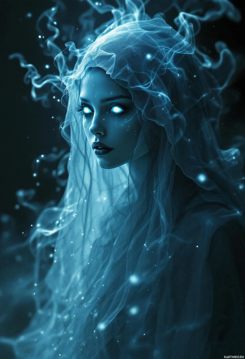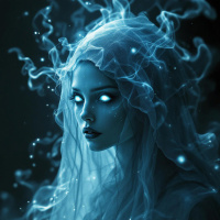 ethereal particles or smoke-like elements surrounding her head and neck area, suggesting a magical or otherworldly presence. The color scheme is predominantly in
