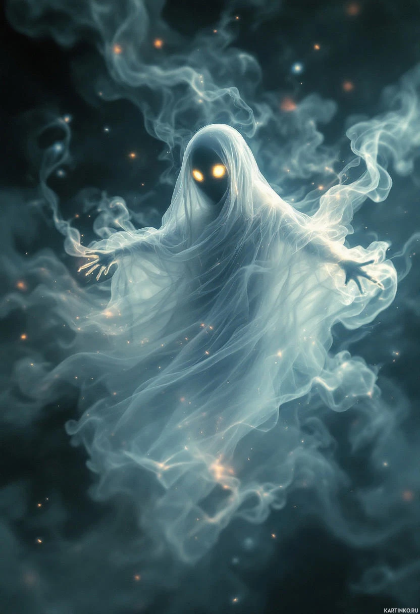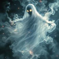 The image portrays a fantasy-themed scene featuring a ghost. The ghost, appearing as a white figure with a hollowed face and
