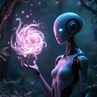 subtle sparkles of light floating around the robot's head, enhancing the fantastical elements of the artwork.