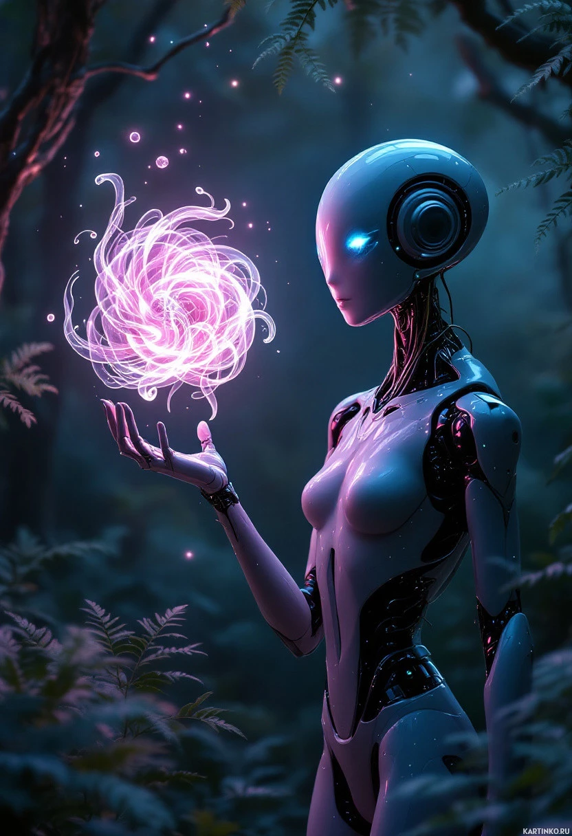advanced technology interface. In one hand, the robot holds a sphere that emits light particles, suggesting