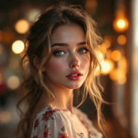 filled background, which includes warm-toned lights that give the photo an intimate and soft atmosphere. Her gaze is directed slightly away from the camera, and she has a gentle expression on her face, with her lips parted as if she's about to speak or laugh.