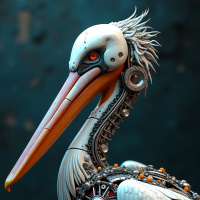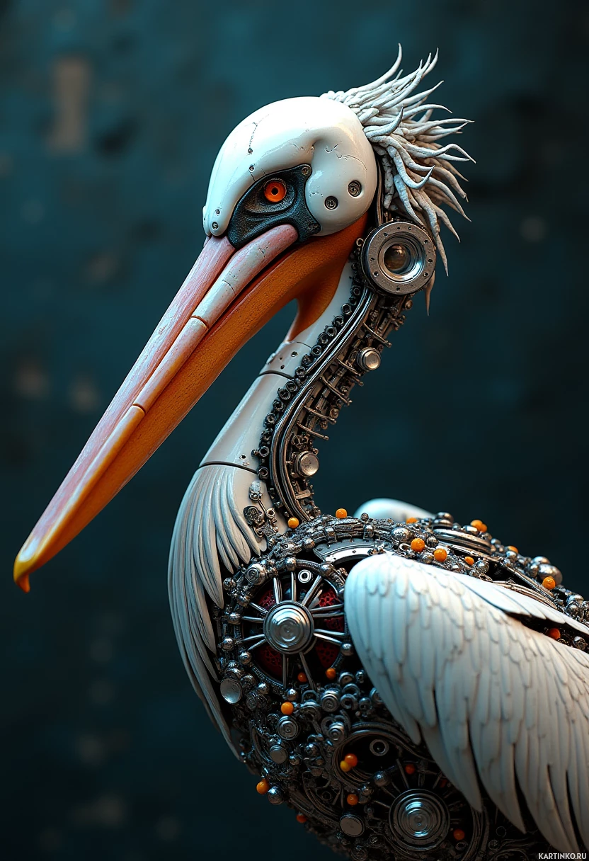 The image depicts a robot designed to resemble a pelican, a type of bird. This robot is adorned with intricate