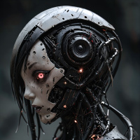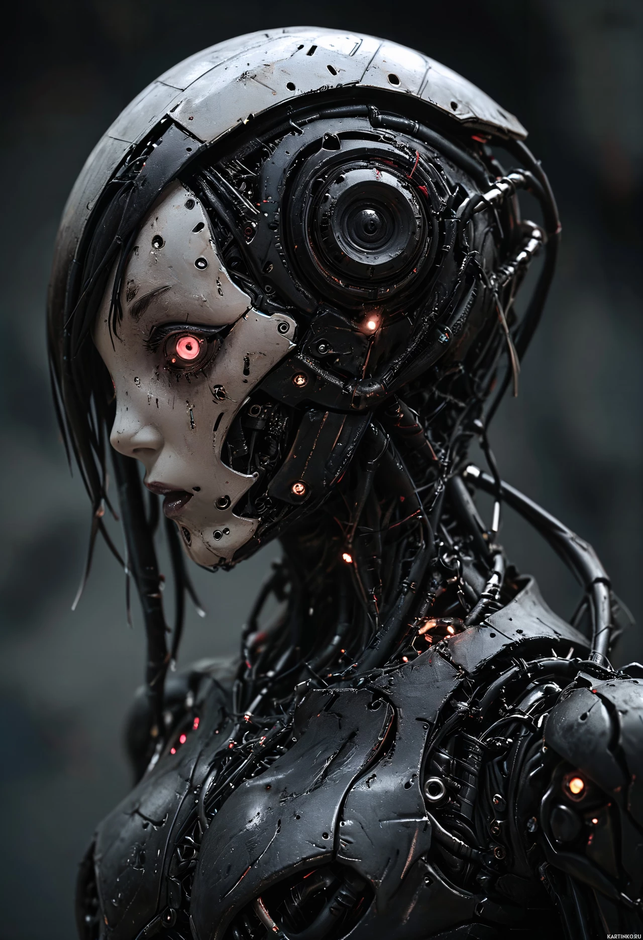 The image depicts a humanoid robot with a human-like appearance. The robot has detailed mechanical components on its head, neck, and shoulders that give it an advanced technology look. Its facial features are also robotic but retain some organic-looking skin, including freckles and hair strands that add a lifelike touch to the otherwise inorganic structure. The robot is set against a dark background with subtle lighting that highlights its intricate details and the contrast between the metal components and the human-like features.